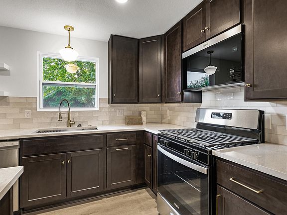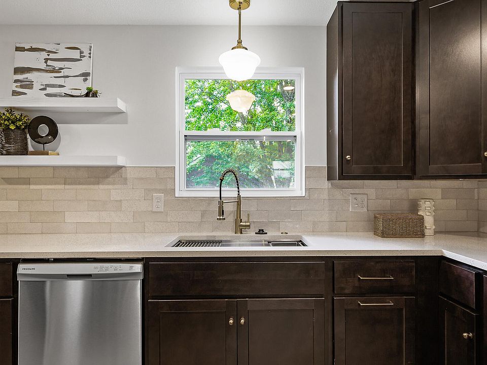 enhanced by all-new windows. The kitchen features a tiled backsplash, stainless steel appliances, and
