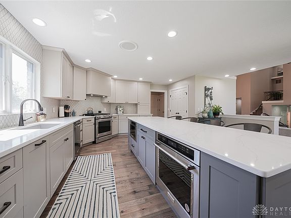 The gourmet kitchen, fully remodeled in 2024, is a centerpiece with custom cabinetry, quartz countertops, a large island, two full-size ovens, a microwave drawer, and a French door refrigerator—perfect for entertaining or everyday living. Updates include new engineered hardwood flooring throughout main areas (2024), new carpet in bedrooms (2023/2024), fresh interior paint (2024), a brand-new dual-unit energy-efficient HVAC system (2024), and a new water softener (2025). The main level also includes a private office, three bedrooms, and a full bath.