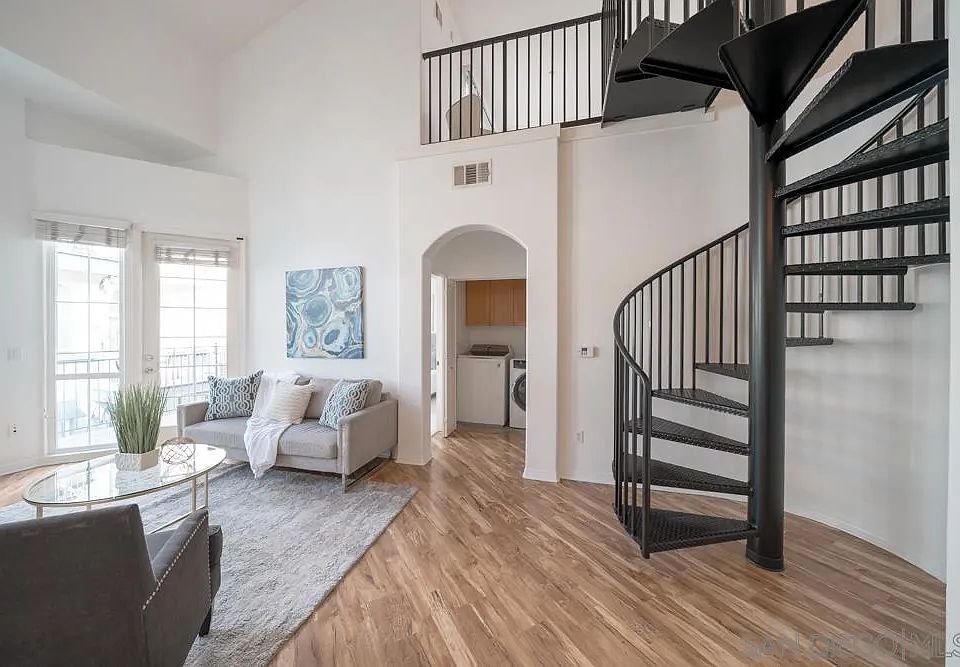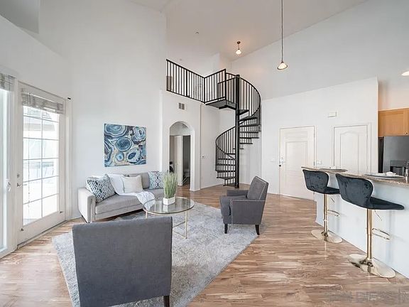 In the sought-after La Bohème community, discover one of North Park’s most stunning residences! This top-floor, west-facing showpiece at Unit 507 features soaring 20+ foot ceilings, and dramatic two-story windows The open layout seamlessly blends kitchen, dining, and living areas, centered around a striking spiral staircase. The primary suite boasts a spa-sized bathroom and a generous walk-in closet, while a second bedroom, full bath, and full-size laundry complete the main level. Step outside to your first private balcony for breezy outdoor living, or head upstairs to the versatile loft—perfect as a home office, media lounge, or guest space—complete with its own second balcony and views of the ocean, Coronado and the islands. Life at La Bohème offers the ultimate convenience: two non-tandem parking spaces, hot tub, gym, sauna, dog wash station, recreation spaces, and HOA dues that cover water, internet, and more. All this in the heart of North Park with a 10/10 walkability score—restaurants, coffee shops, breweries, and boutiques are just steps away.