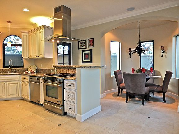 Spectacular Spanish eclectic built in 2007. 3 Bedrooms, 2.5 bathrooms with attached 2 car garage. Gourmet Kitchen with light cabinets, granite counter-tops and Jenn-Air appliances including a stainless steel glass hood. Master bedroom suite with reading area and double doors to the Juliet balcony. Master bathroom with walk-in shower, Jacuzzi tub and fireplace. Travertine, wood flooring and new carpet throughout. 2007 construction with copper plumbing, 200 amp electrical panel, vinyl windows and HVAC. Custom iron work and crown moldings. The exterior includes 3 fountains, stamped cobble ...stone hardscape, smooth coat stucco, tile roof, iron entry door, and two Juliet balconies.