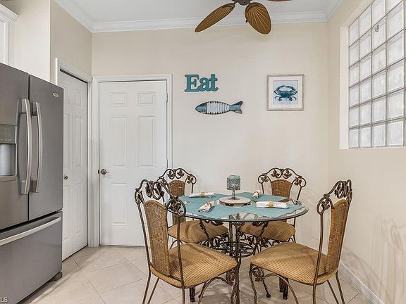Ground-floor entryWest-facing extended screened lanaiLight tile floorsCrown moldingRear sliding doorStainless steel appliancesWhite cabinetry