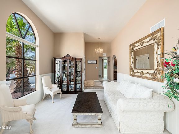 Unique & remodeled this 3100 sq ft custom home in Equestrian Estates has 4 beds, 3 baths with a 625sq ft guest house with its own great room and 2 bonus rooms making it a very rare find. Nestled on a premium corner lot with north/south exposure this home only has 1 direct neighbor for the ultimate in privacy. Surrounding the entire back & sides of the home are Security Shutters offering incredible safety, privacy & energy efficiency. The main house has a very desirable split floor plan with 3 beds on the east & 1 bed on the west with its own dedicated bath & exterior door, perfect for a guest or mother-in-law suite. The primary bedroom enjoys new travertine stone flooring, travertine shower & new soaking tub, walk-in closet, crown molding & backyard views. Spacious open living room & dining room w/vaulted ceilings, large windows with beautiful mountain view's. Rustic den with exposed wood beams, vaulted ceiling, wet bar, 2025 stacked stone fireplace with limestone hearth & French doors leading to the great room. The spacious great room with crown molding, a stone fireplace & doors leading to the backyard, pool & magnificent sunsets. The breakfast nook also gives you a soothing view of the PebbleTec pool & palm trees. The gourmet kitchen boasts 2 pantry's, a walk in & a large cabinet pantry next to the refrigerator. The kitchen is equipped with matching Whirlpool SS appliances, large granite counters & a prep island. The remodeled guest house is perfect for a home/office, out of town guests or a place for your kids to have a sleep over. It offers a large 22x19 great room plus 2 bonus rooms, w/ French doors & crown molding ideal for an office. The backyard with a children's playground, a new R/V gate, natural grass, diving pool, hot tub & 6 palm trees makes it an Arizona Oasis! You have to see this home to appreciate how spacious every room is & the attention to detail! All new ceiling fans throughout. 2025 new bathroom & bedroom doors. Late 2024 new AC. 2025 roof tile. Replaced windows. 2025 barn doors in the bedrooms & casita.
