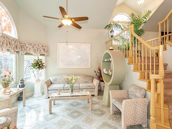This stunning custom home is nestled amidst gently rolling hills in one of Palmdale's most prestigious neighborhoods & an unobstructed panoramic view of the Antelope Valley below. Its white picket fencing w/pillar lighting, lush landscaping, swaying palm trees, custom brick walkway, front courtyard with post lighting, & portico entry enhances its eye-catching curb appeal. The front door swings open to the formal foyer w/its soaring ceiling, designer paint scheme & custom tile flooring. The formal living room is bathed in natural light from a gigantic picture & custom arched window. The family's cook will appreciate the kitchen's abundant cabinets, easy care tile counters with full back-splash, very large center island with built-in blender, sit down breakfast area w/lighted ceiling fan & direct patio access, plus the adjacent formal dining room & family room with its drop down ceiling fan, media alcove, & gas-burning fireplace. All 3 bedrooms have lighted ceiling fans; The master suite