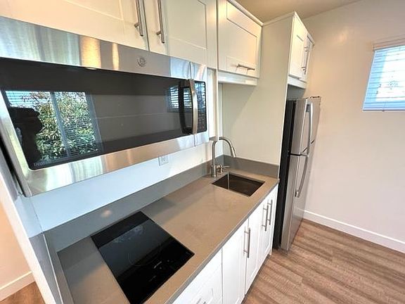 Decent size closetQuartz countertopsStainless fridgeRecessed lightingVinyl plank flooringBrand new cabinetryElectric cooktop