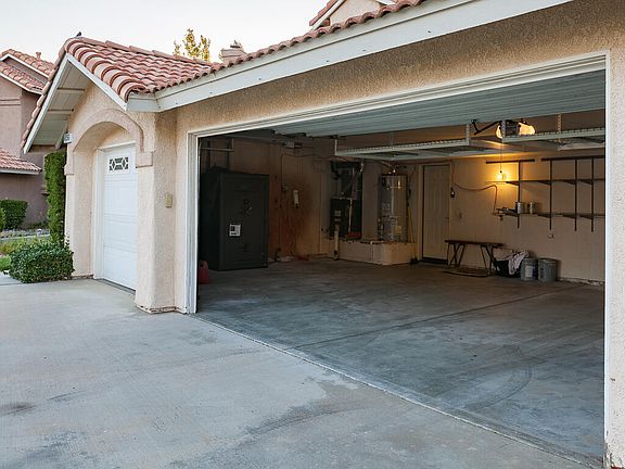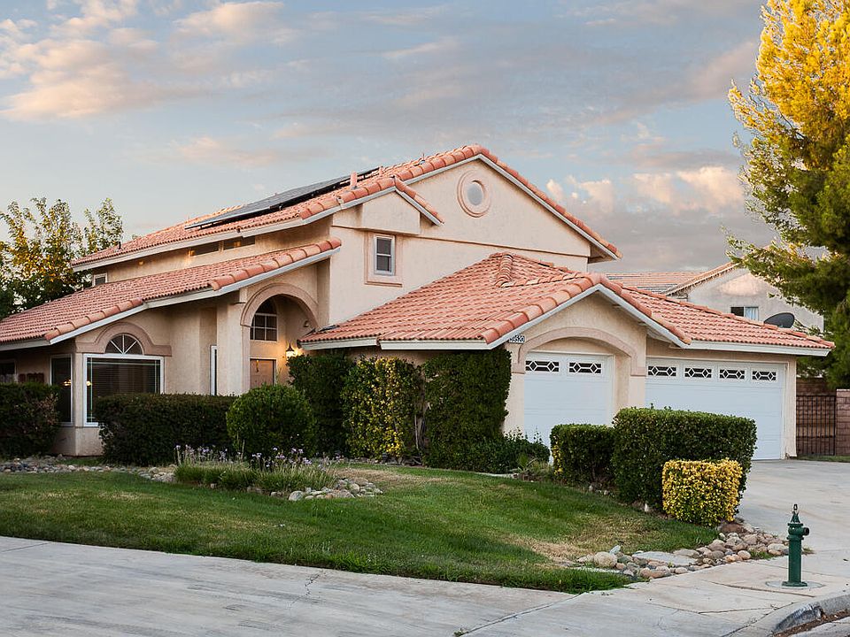 This west Palmdale home enjoys an ideal location - tucked into an established neighborhood on a quiet cul-de-sac just minutes from the premier shopping area of the Antelope Valley, the freeway and schools. The two-story design is much desired because it includes a junior master suite with private bathroom downstairs and a master suite with private bathroom upstairs to serve a variety of occupancy situations. Mature landscaping provides curb appeal; the wide driveway and 3-car garage provide for plenty of parking and storage. Recent improvements include newer energy-efficient windows, a kitchen remodel in 2012 and a newer HVAC unit. Neutral tile flooring flows throughout the entry, living room, kitchen, bathrooms and laundry room. The kitchen with granite counters opens to a family room made cozy with a fireplace and includes a sliding door to the backyard. Upstairs, the spacious master suite includes a private balcony overlooking the backyard and This west Palmdale home enjoys an ideal location - tucked into an established neighborhood on a quiet cul de sac just minutes from the premier shopping area of the Antelope Valley, the freeway and schools. The two-story design is much desired because it includes a junior master suite with private bathroom downstairs and a master suite with private bathroom upstairs to serve a variety of occupancy situations. Mature landscaping provides curb appeal; the wide driveway and 3-car garage provide for plenty of parking and storage. Recent improvements include new energy-efficient windows, a kitchen remodel in 2012 and a newer HVAC unit. Neutral tile flooring flows throughout the entry, living room, kitchen, bathrooms and laundry room. The kitchen with granite counters opens to a family room made cozy with a fireplace and includes a sliding door to the backyard. Upstairs, the spacious master suite includes a private balcony overlooking the backyard and a spa-like bath with dual sinks and separate garden tub and shower. Two more sizable bedrooms and another full bath complete the home. The peaceful backyard features a covered patio and grassy area shaded by mature trees. Bonus: The big Winchester safe in the garage stays!