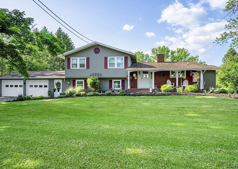 HOUSE OF THE WEEK June 18th Post Standard. Serene Waterfront living with 200' on Oneida River with Dock and over 2 Picturesque Acres is the setting of this impeccably maintained and expanded 3 bd, 3 full bath Split-level home! Year-round addition with Vermont castings gas stove. Beautifully Expanded Primary Suite features heated floors in newly renovated bath, custom blinds, walk-in closet. Heated Floors under the beautiful hardwoods for entire main floor of Kitchen, Formal Living and Dining Rms. Living Rm Fireplace. Huge lower-level Family room 23' x 22' and full bath. Oversized heated garage 32'7" x 26'5" with Pull Down Stars for extra Storage. Plenty of basement storage with laundry. Shed. Central Air. Hot Water Heat. Beautiful Landscaped setting is a Certified Wildlife Habitat. Waterfront lease is only $100/year or can be purchased. New Septic tank with public sewer connection available.