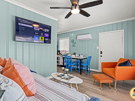 Inside, the bungalow features versatile sleeping arrangements with a queen bed, twin beds, a daybed, and additional options to accommodate guests of all ages. The remodeled kitchen is fully equipped with modern appliances, a coffee bar, and ample cookware for everything from quick snacks to full meals. Other thoughtful details include high-speed Wi-Fi, Smart TVs, air conditioning, fresh linens, bath essentials, and an in-unit washer and dryer.
