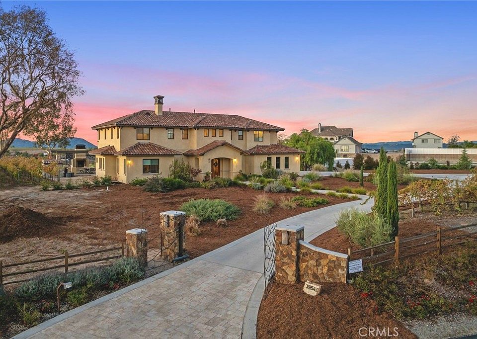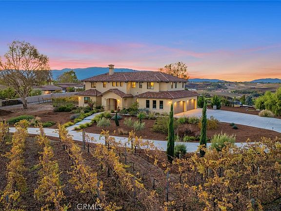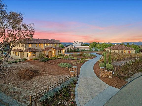 INCOME POTENTIAL! Live in one and rent the other! RARE opportunity to own not ONE but TWO Tuscany inspired homes perched on a hill offering STUNNING views from every angle. Perfectly situated on just over 2 acres these 2 Temecula wine country homes are dripping with old world sophistication. Cul-de-sac location means little to no traffic. The security gate at bottom of the driveway makes for a DRAMATIC ENTRANCE, leading you to up to the estate, passing vineyards and 3-bedroom residence on the right bringing you to the 4-bedroom main residence on your left. Main house offers a brand-new custom pool with smooth pebble tech coating & Lunada bay glass tile complimented by a 10 person spa. Have THE BEST soirée with your own custom wood fired pizza oven, outdoor wood burning fireplace & gas firepit. Step through the custom knotty Alder entry doors and notice the soaring ceilings while taking in the breathtaking valley views through the solarian windows past the pool, spa and firepit. Formal dining room sits in the Solarian window setting perfect for evening entertaining and taking in the valley lights. Just off the GREAT room adorned with a fireplace, you’ll find a spa inspired junior suite with a full bath opposite the office and downstairs powder room. Kitchen features high end appliances & finishes offering side-by-side Subzero fridge, Wolf range oven, 2 Bosch dishwashers, Wolf microwave, Kohler faucet, Cambria Ella quartz island counter w/contrasting quartz counter, & handmade Spanish Subway tile backsplash. Upstairs, a secondary private family room, separating the generous Primary Bedroom & Bath from 2 additional Bedrooms and Baths. Just off the family room, an OVERSIZED balcony w/ INCREDIBLE VIEWS overlooking the tranquil vineyard. Flooring upgrades include Colonial Collection European oil finish Oak, Custom American Oak stair treads & a combination of Quartz, Marble & Granite throughout. In addition, custom wood cabinetry, solid core interior doors, Dual System high efficiency AC units, whole house attic fan, Santa Barbara smooth stucco, Gas burning fireplace w/flagstone facade w/ custom live edge oak marble, authentic clay roofing, and sound system. 2ND home offers 3 beds/3 baths~situated offering sweeping views of San Jac mountains w/Stainless Steel appliances, Quartz counters, & fire pit. Drip irrigation means annual water bill <than 1700.00 for both homes. 40 owned Solar covers most if not all usage. FIRE SPRINKLERS AT BOTH HOMES.