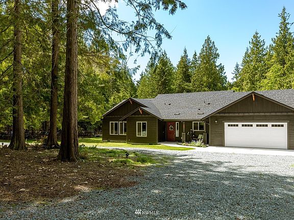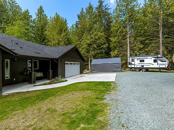 Enjoy your very own private forest oasis, originally two 5 acre lots, tucked away on a private road within a well maintain community. Newly built rambler w/ lots to offer. Conveniently located from restaurants, stores, bus stops, & ferry. Home offers open floorplan w/ custom master walk in shower/bath, pasta spigot/pot filler, large southern-facing windows, central floor outlet, HVAC heat/cool, RV parking w/ RV outlet, generator outlet, fenced for large livestock, horse round pen, gated driveway, oversize locking mailbox, community well on auto generator, 3 year old fruit trees (cherry, apple, asian pair, jumbo peach) conduit set & ready to use for future gate & fence wiring, & much more. Great investment opportunity. Come see for yourself.