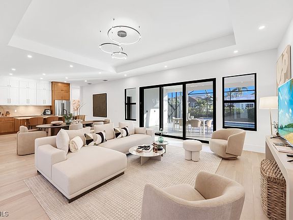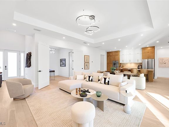 This NEW CONSTRUCTION pool home is Nestled mere moments from the sugar white sands of Bonita Beach, this impeccably reimagined coastal contemporary residence embodies refined luxury and serene sophistication. Built to the highest standards, the home greets you with soaring ceilings, wide-plank European Tile, and an abundance of natural light that dances across crisp architectural lines and curated modern art. The heart of the home is an open concept great room flowing seamlessly into a gourmet kitchen adorned with custom two-tone cabinetry, exquisite quartzite waterfall counters, and premium stainless appliances. A generous island with leathered-finish seating invites effortless entertaining, while expansive IMPACT RESISTANT glass doors frame tranquil pool and garden vistas, blurring the boundary between indoors and out. The primary suite is a private sanctuary of understated elegance: a voluminous bedroom with tray ceiling, a spa inspired bath featuring dual floating vanities, matte-black fixtures, an oversized frameless glass rain shower, and a freestanding sculptural tub. Three additional guest suites, with 2 en-suite baths finished in porcelain and natural stone, offer family or visitors the same level of thoughtful luxury. Every detail has been considered designer lighting, custom built-in millwork, a chic laundry suite with ample storage, and a spacious three car garage. Outside, the screened lanai and heated pool create a resort like escape, perfect for sunset cocktails or al-fresco dining under the palms. Located in one of Bonita Springs’ most coveted enclaves, this turnkey masterpiece places you steps from the Gulf’s turquoise waters, Fine dining with in minutes, and the vibrant energy of Bonita, Naples and Fort Myers all while offering the quiet privacy of a true coastal retreat. An exceptional offering for the discerning buyer seeking timeless design, impeccable craftsmanship, and the ultimate Southwest Florida lifestyle.
