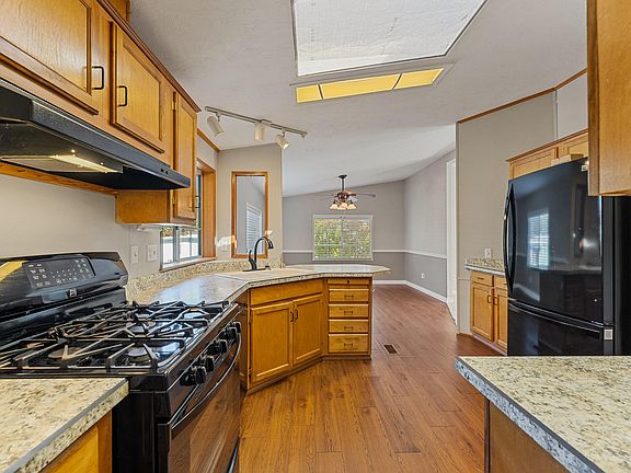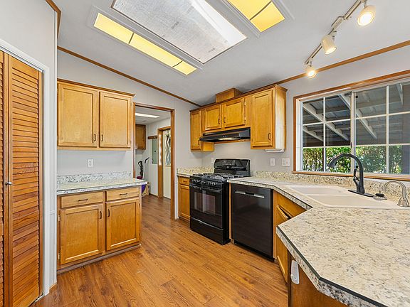Outstanding home in one of Medford's premier 55+ parks! Just minutes to Jacksonville and surrounded by vineyards and gorgeous mountains! This 1456 Square Foot, built in 1990 home has been well cared for and maintained to perfection. Beautiful landscaping, private patio, covered protected carport with wood awning and large storage room/shop. The bright floorplan offers an abundance of windows and natural light, a large kitchen with pantry, gas range, formal dining room, an office/craft room, skylights, 2 bedrooms, and 2 baths, the primary bath boasts a step-in shower and double sinks while the second bath has a bathtub/shower combination. Move in Ready! Call for your personal tour!