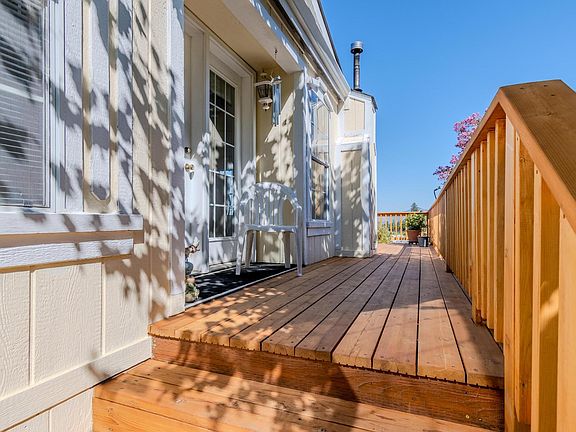 Well-maintained 1431 sq.ft. home with 2 bed, 2 bath + office in Western Carriage Estates, a 55+ community with a peaceful rural feel. Open floor plan with vaulted ceilings and a pellet stove with slate surround connects living and dining areas. The brand new wrap-around deck is a great spot to relax and take advantage of the sweeping Valley views. Spacious kitchen with skylights, laundry room with desk and storage cabinet. Situated on the top terrace of the park this is one of the few homes with such a setting. The fenced yard provides privacy and space for pets or gardening. Additional features include covered parking, a wheelchair lift, and convenient access to Jacksonville, Medford, and nearby vineyards. Newer roof and heat pump. Listing agents related to seller.