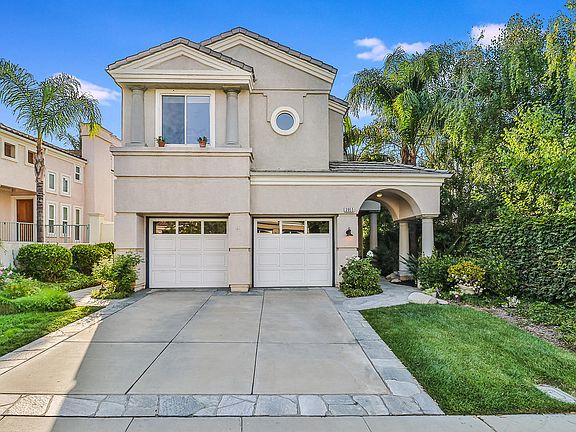 Amazing big, private yard with views is only one of the special features of this lovely well cared for home. Cathedral Ceilings and wood floors great you into spacious living room with fireplace plus formal dining room. The remodeled kitchen has extended counter with seating, plus room for table, granite, stainless steel appliances, stone backsplash, redone cabinets all in warm neutral colors while open to family room with additional fireplace. Upstairs good size secondary bedrooms have closet built-ins and share a bath, separate upstairs laundry room. Master is large with views and master bath has walk in closet, double vanity, spa tub and separate shower. Three baths total with half downstairs. Two car garage with lots of storage, cul-de-sac location, close to pool but still private. Stone enhanced patio with firepit and covering. This home is light and bright in wonderful location of everything Moorpark has to offer.