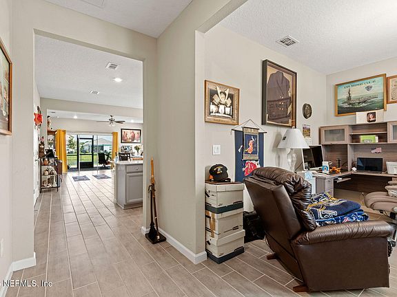 Practically new construction with lots of upgrades! As you enter you will love the tile floors that flow through the main living areas. First find the flex room that would make a great dining room or office. Then flow to the beautifully upgraded kitchen with quartz counters, farm sink, and tons of cabinet & counter space. There's a breakfast bar for quick bites and a table space for more formal meals. The kitchen opens into the large family room. The Primary bedroom is a good size and the attached bathroom has dual sinks, soaking tub & separate shower. The guest bedrooms are split from the master and share the guest bathroom. Out back enjoy the afternoon from your screened lanai or get sun on the extended patio overlooking a fenced yard and peaceful pond. All this plus the great Greyhawk amenities including pool, playground, tennis court & fitness center! Don't miss this great home!