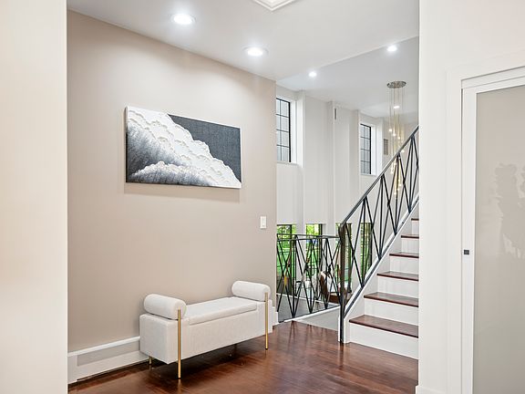 Main level features hardwood floors, abundant natural light, and an updated kitchen with stainless appliances and tile backsplash. Bedrooms and the finished lower level have plush carpet; all four baths are updated with modern tile/fixtures. The primary suite includes a walk-in closet with a 2-in-1 washer/dryer; there's a second full laundry on the main level.