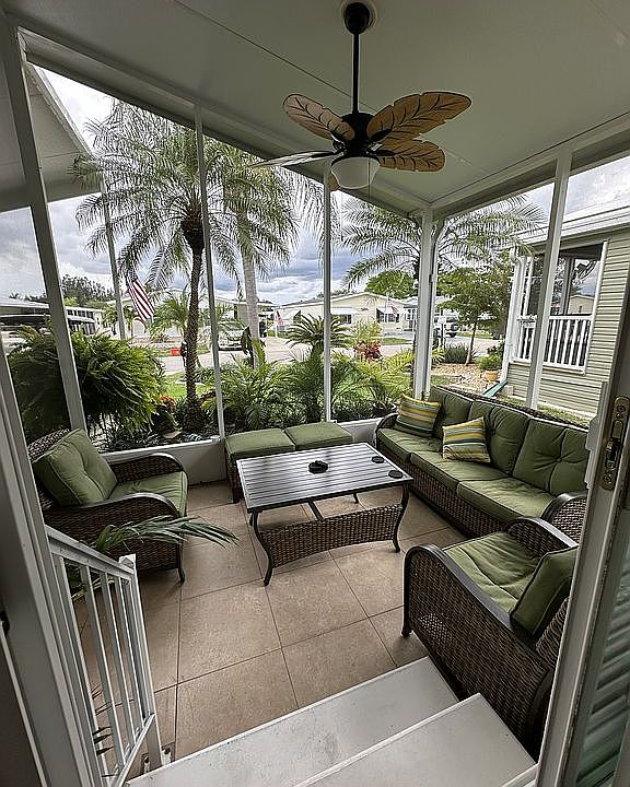 Each room offers thoughtful details such as ceiling fans, plantation shutters, and mounted televisions. The primary bedroom features an ensuite bathroom and the guest bathroom offers a bright skylight. The large screened-in lanai is fully furnished with new outdoor seating, a ceiling fan, and a wall-mounted TV—perfect for relaxing or entertaining outdoors.