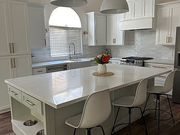 Large center islandCustom cabinetryHigh-end stainless-steel appliancesSolid slab countertopNewly redesigned open-concept kitchenBright spacious layoutBuilt-in drawer microwave