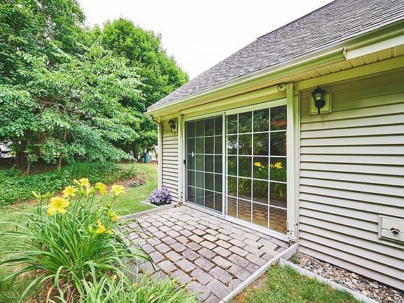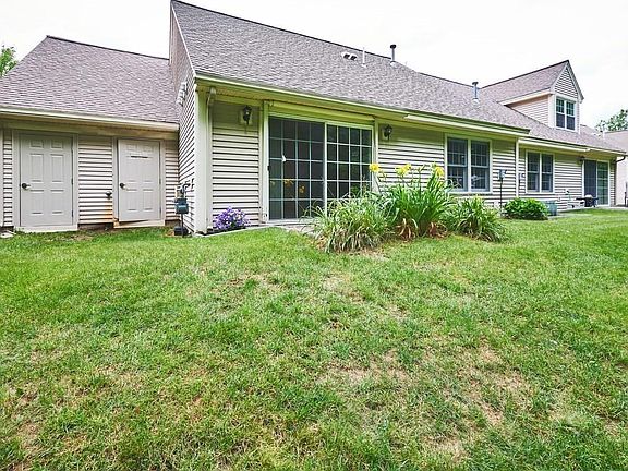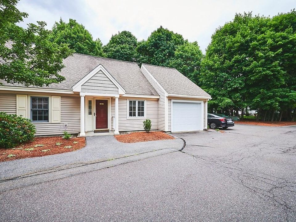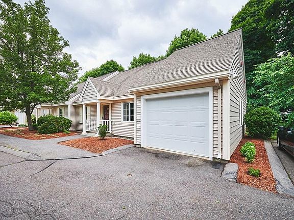 Rare opportunity to own a beautiful end unit townhouse in the sought-after Danforth Village! Single family feel without the snow shoveling and exterior maintenance! Park your car in the attached garage, and enter this charming and inviting single level home. Eat in kitchen partially opens to spacious bright living room with sliding glass doors to private patio and a tranquil view of wooded area. Main bedroom has en suite full bathroom. Washer dryer in unit. Second bedroom or home office and half bath perfect for guests. Storage in garage, and attic. The Meeting/Club House has a grand living room w fireplace, full kitchen, office/ library, tables & chairs perfect for gatherings with family and friends. Enjoy carefree living in this very appealing 55+ complex in close proximity to town hall, library, restaurants, senior center, and shops.