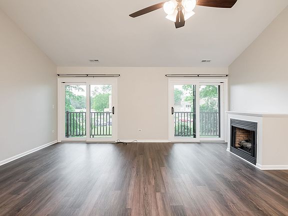 Freshly updated, move-in ready! This spacious 2 bed/2 bath welcomes you with high vaulted ceilings and plentiful natural light. The living room is well equipped with a gas fireplace and access to your oversized balcony. The dining area is adjacent to the updated kitchen - ready for your dinner parties. The split floorpan delivers ideal privacy, with both bedrooms on opposite ends of the home. The primary suite features generous closets and an ensuite bath.The second bedroom is prime for home office or guest accommodations. The home is equipped with In-unit stackable laundry as well as direct garage access to your one-car garage. One additional outdoor parking space is also included. The community features a beautiful outdoor park and play area for families to enjoy. Centrally located for easy access to College of DuPage, Morton Arboretum, Village Links Golf Course and neighboring town of Wheaton. Welcome home.