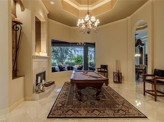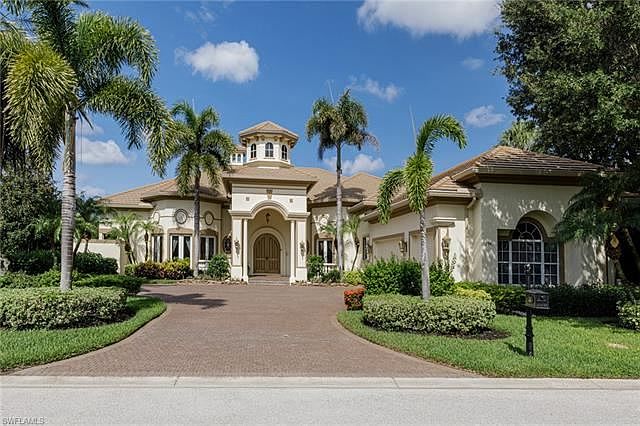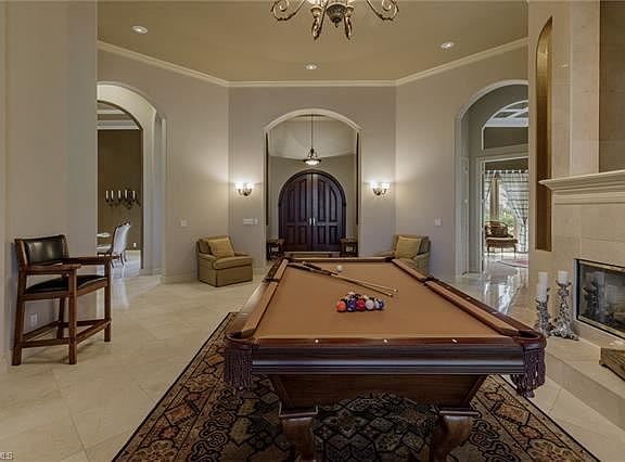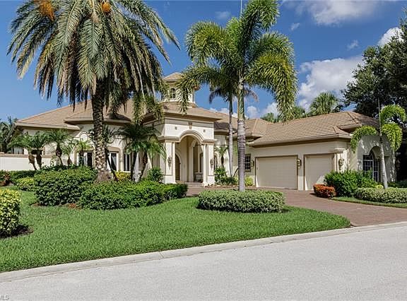Entertainers Delight! Expansive 1 owner estate home w/ western exposure. Exquisite double arched doors open into the large foyer/living room w/ a window wall displaying a fabulous view of the extra large screened lanai pool/spa and great golf course backdrop. The formal living rm features marble floors which extend thru most main rooms, 18' coffered ceiling & a marble gas fireplace. Each room has 14' ceilings with unique high coffers to match room shapes. The spacious open kitchen with a large central island, SS appliances, double ovens, built in pantry, & 42" wooden cabinets all overlooking the great room. Zero corner 10' sliders in the great room & master suite open to the 1800 sq ft lanai which features a cedar ceiling, outdoor kit, special lighting, ceiling fans, & elec hurricane shutters. 3 guest bedroom en-suites, formal dining room, bar/wine room with wine chiller, & large den/office w/ built in desk/ bookcase & large laundry rm, Master suite includes cherry wood floors, sitting area, 2 walk in closets, coffee bar w/ frig and sink. Fabulous bathroom walk thru shower, bidet & Jacuzzi Tub. Extra features: whole house propane generator and epoxy floor in the garage.