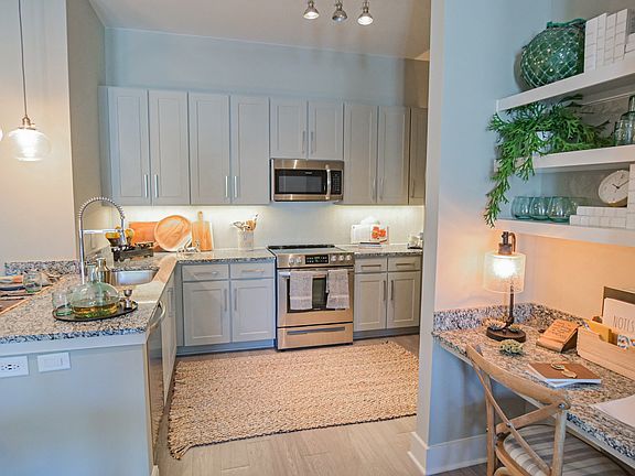 - Exterior features: , 10' Ceilings and 8' Doors Throughout*, 2 Electric Vehicle Charging Stations, Balcony, Bicycle storage, Built-In Computer Desk*, Business Center, California Closet Systems*, Coat Closets, Corporate All-Inclusive Apartments Available*, Decora Rocker Light Switches, Designer 42 Inch Cabinets, Detached Garages, Granite Countertops in Kitchen & Bathrooms, Guest Suites Available for Residents' Guests, Kitchen Island*, Large Bathroom with Extended Vanity and Window*, Large Double Windows, Lawn, MOEN Premium Kitchen Plumbing Fixtures, Multiple Conference Rooms, Outdoor Wi-Fi in Gathering Areas, Oversized Kitchen Breakfast Bar, Package Receiving, Pet Park, Pet Washing Station, Pet-Friendly Community, Picnic Area, Porches/Balconies, Screened Porches*, Secure Mail Room, Theater, USB Outlets, Under cabinet Lighting in Kitchen*, Wide Plank Flooring, Yoga Studio Featuring The Mirror