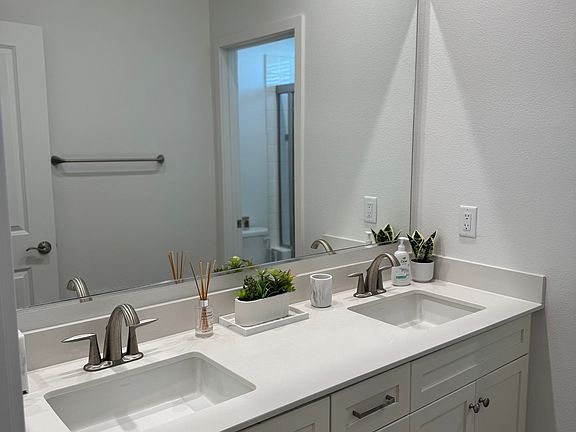 This furnished bedroom shares one full bathroom with two sinks. The current residence is occupied by three other amazing tenants; two working in aerospace and one in health & wellness.