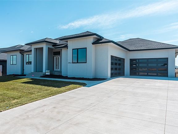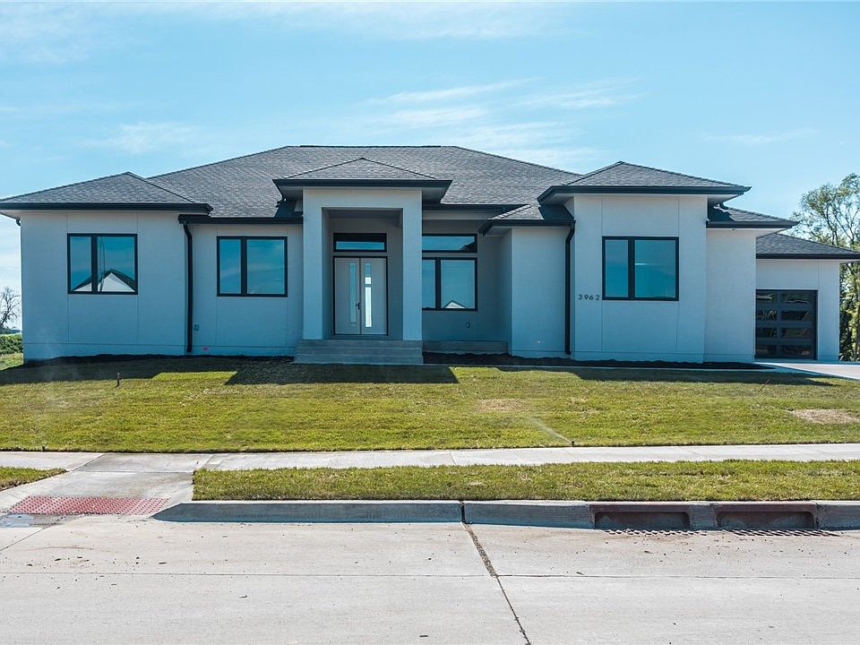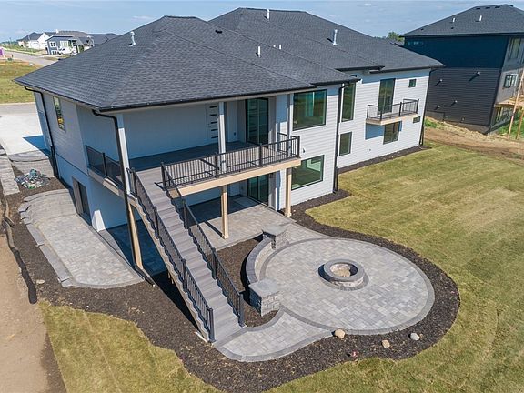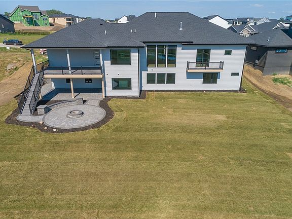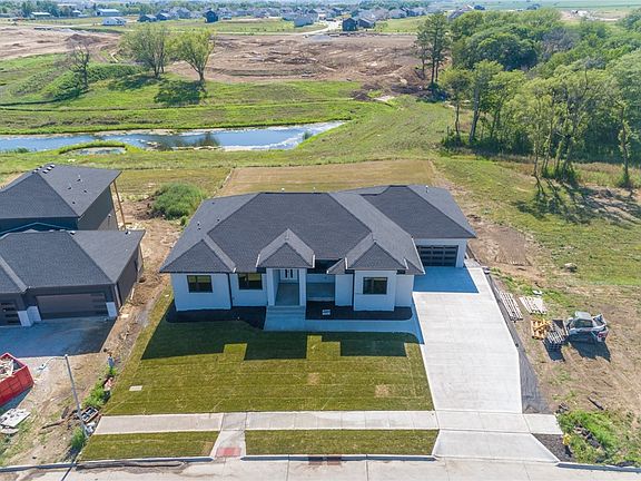 This home has it all! This 6 bedroom walk-out ranch sits on a lovely level lot with pond views. The large lot can easily accommodate a pool. At almost 5000 finished, the home is perfect for a large family offering 4 bedrooms on the main level. One smaller bedroom with closet can also be used as an office. Hardwood floors adorn each bedroom. The primary bedroom offers an oversized closet, a bathroom with double sinks, soaking tub and double headed shower along with a private balcony. The chef's kitchen showcases the Cambria quartz waterfall island, full size frig & freezer, gas stove and large pantry with pass through door to garage. The main room offers floor to ceiling windows showcasing the view. Designer tile can be found in each of the bathrooms and laundry room. Downstairs offers upgraded patterned carpet, two bedrooms with Jack & Jill bathroom, a large family room with kitchen (full size frig & waterfall island), another bathroom with double sinks and large tiled shower, workout room and a tiled floor room perfect for a wine cellar. Hidden behind the pantry door is access to the utility garage with another sink and commode. Two 2 car garages offer glass garage doors, a vanity and access to the oversized patio. The home also offers central vac, 8' solid door, epoxy garage floors and a beautiful paver patio & fire pit. Final completion is end of August. This is a must see!!