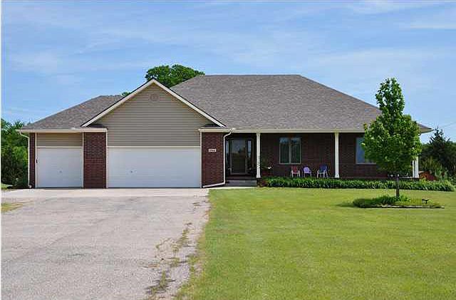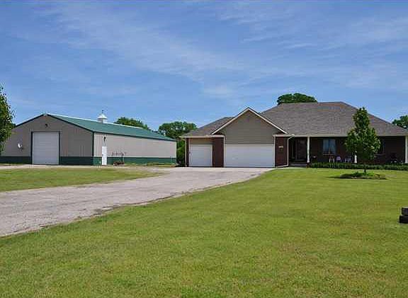 Welcome to Meadowlark Estates in Goddard. A large lot community where neighbors are friendly and not right on top of you. This home boasts a large 5.79 acres that backs up to a large tree row. There is a huge 40x80 insulated, powered shop with a concrete floor and 2 commercial overhead doors on each end. It doesn't stop there either, every wall and the ceiling are insulated and large plastic, retractable partitions are hung to section off areas for the propane heat. Did I mention there is a bathroom in the shop too? Perfect for parties or family gatherings. From the moment you drive up you will notice how large the house, shop and yard are. Inside the front door the wide open space will immediately grab your attention. Off the living room is a large den area that is perfect for an office or informal gathering area. The master suite has a bathroom with an extra large 5' shower stall. As you venture down the stairs you will notice the 2 basement bedrooms each have their own bath. Both bedrooms are perfect for teenagers as each room is lined in sound proofing board on the walls and ceiling. The rest of the finished basement area has the sound proofing board on the ceilings so you don't always hear the footsteps from upstairs. Out the sliding door of the true walk-out basement to the gardening areas, playhouse and playground. Schedule your exclusive viewing today to see what else this property offers. All this home needs now...is you!!