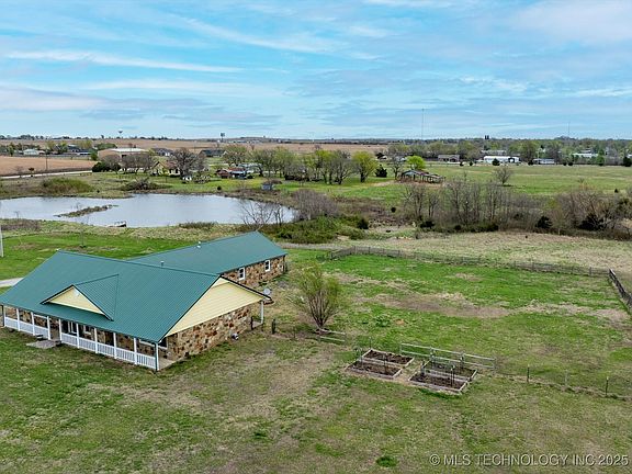 Wonderful country home on 25 +/- acres in Ochelata, OK! This 3 Bedroom, 2 bath split floorplan home is conveniently located with quick access to HWY 75 for access to Tulsa, Owasso and Bartlesville. This open concept home welcomes gatherings by the fire and features a spacious custom kitchen with a 5-burner gas cooktop, stainless farmhouse sink and double full size wall ovens, adorned by ample storage space. The primary bedroom suite offers a separate whirlpool tub and shower with bench and large walk in closets. The oversized garage features 220 electrical and an additional 20’x30’ porte-cochere that can be closed off on the north side with electric overhead garage doors for both. Spend your evenings watching the sunset to the west on your covered front porch and the mornings watching it rise on the rear covered porch. When you step outside, you will find a fenced backyard area, ample wildlife including deer, a huge stocked pond with dock and creek, and a lean-to/hay storage barn at the back end of the property. Seller is offering a $5,000 buyers credit with acceptable offer so the new owners can pick flooring of their choice for the bedrooms as the carpet has been recently removed. Kitchen Refrigerator, Garage Refrigerator, Washer, Dryer, and a New in the box $3,700 Freeze Dryer are all included. New complete HVAC system in March 2025 with transferrable warranty! [Home includes a 10+/- acre lot and a 15+/- acre lot]