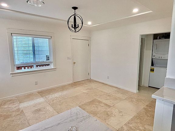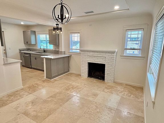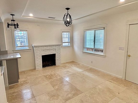 This newly renovated one-bedroom, one-bath home features a charming white brick fireplace, elegant tile flooring throughout, and modern light fixtures. The kitchen boasts updated cabinetry and countertops, creating a stylish and functional space.