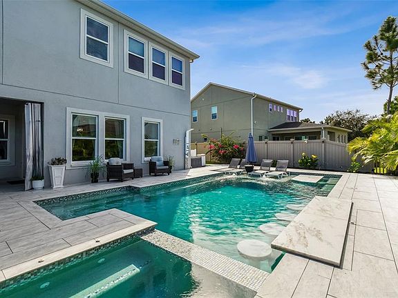 Welcome to this stunning Bedford model by Standard Pacific in the coveted Estancia at Wiregrass. This home offers approximately 3,644 sq. ft. with 4 bedrooms, 3 bathrooms, an office, loft (easily converts to 5th Bed), bonus room, pool, and a serene pond view! The original owners have meticulously maintained this property and invested over $200,000 in upgrades. As you enter, you’re greeted by a grand foyer with custom trim molding on the walls, ceilings, and windows. The first floor features crown molding, wood flooring, and abundant natural light. The home office provides privacy with French doors and matching custom trim work. The kitchen boasts 42” tall soft-close white cabinetry, a gas stove, double ovens, Wi-Fi-enabled refrigerator, granite countertops, built-in trash cabinet, and a full-height backsplash. Adjacent to the kitchen, you’ll find a beverage station with a cooler, perfect for entertaining or daily convenience. The oversized walk-in pantry features solid wood shelving and a custom built-in microwave. The first floor’s open-concept layout provides full views of the resort-style pool deck. The main living room includes a custom-built electric fireplace with an accent stone wall. For guests or multi-generational living, a private bedroom with a full bathroom is conveniently located downstairs. Upstairs, you’ll discover an open loft, bonus room, laundry room, and the remaining bedrooms. The primary suite offers a coffered ceiling, crown molding, a 9x10’ sitting room, elegant fixtures, and wood flooring. The spa-like primary bathroom includes a double vanity with granite countertops, an oversized shower with rain feature, linen closet, and water closet. The upstairs bonus room is designed for entertainment, complete with a wet bar, beverage cooler, cabinetry, and a projection screen with projector (conveyed with purchase). Step outside to your resort-style pool oasis. Pool specifications include a natural gas heater, saltwater system, Wi-Fi control system, 7x10’ spa, 19x33’ pool, sun shelf, dining area with table and umbrella sleeve, wet bar with granite countertop and permanent barstools, upgraded shell finish with Swarovski crystals, and an outdoor shower. The low-maintenance deck features modern Italian Dolomite porcelain tiles that are anti-mold, anti-slip, cool to the touch, and require no sealing. Enjoy ultimate privacy with mature tropical landscaping and a fully fenced lot with two side gates. There is still ample green space to enjoy. The lanai is pre-plumbed by the builder for natural gas, electric, hot/cold water, and sewage, offering endless possibilities for future upgrades. A gazebo with nearby power is ready for your outdoor TV setup, perfect for watching shows or games from the spa. Also, a wonderful bonus of beautiful sunset out the backyard. The home’s exterior was recently painted with upgraded Sherwin-Williams paint. Furnishings are optional, making this an ideal move-in ready opportunity in Wesley Chapel. Club Estancia amenities include a gym, zero-entry pool, lap pool, tennis courts, basketball, pickleball, dog park, trails, tot lot, a grand clubhouse, and more! Conveniently located near I-75, Wiregrass Mall, AdventHealth Hospital, BayCare Hospital, Orlando Health, The Krates, restaurants, and top-rated schools. Low HOA and no flood zone. Don’t forget to watch the virtual video tour.