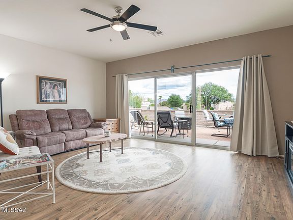 Why do we love coming home? Is it Comfort, Security, Serenity? These qualities describe the feeling standing in the great room of this end unit townhome. A cheerful, intimate space of light tan walls complimented by the warmth of natural looking engineered wood flooring. Then enhanced by the quiet beauty of nature as the desert and mountain views appear through the rear patio slider. When not occupying this home, activate the rolling security shutters to protect your safe place. The wood floors and light interior carry through to the guest ensuite and primary suite separated by the great room. The primary suite contains an office, two closets (one walk-in) and a beautiful bathroom remodel. Pamper yourself in a spacious shower of floor to ceiling tile and linger at an executive height dual-sink vanity of weathered oak and soft close drawers, gently illuminated. The Santa Fe style architecture of this townhome, typical in this gated community, is well represented in the large, centrally located Green Valley Recreation complex. A one-mile walking trail also meanders through The Springs, adjacent to the longer De Anza hiking/biking trail, and near the championship Torres Blancas Golf Course.