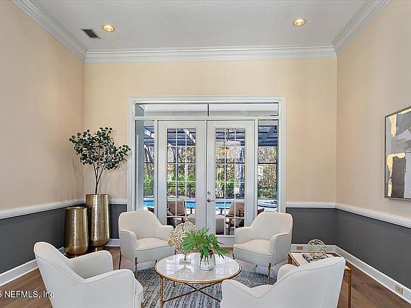 Welcome home to this 5 BR, 3 BA preserve lot home in Jacksonville Golf & CC. Gorgeous European oak flooring & attention to detail millwork greet you upon entering. 12' ceilings throughout the main areas & primary bedroom. Dining room can seat 8 and the lounge w/French doors leads to poolside. Kitchen has incredible storage w/an island. Family rm w/gas FP, full wet bar wall great for entertaining & flows into the eat-in area & breakfast bar. Primary suite w/his & hers walk-in closets, sitting area & lanai access. Primary bath w/double vanity, jetted tub & large shower. Bedrms 2 & 3 share hall bath which is also accessible from bedrm 2. Bedrms 4 & 5 share 3rd bath. Tall windows w/Plantation shutters provide natural light. Enjoy family time around the pool & spa and bask in the peacefullness of the preserve & fenced backyard. 2024: ROOF, HVAC, HWH, POOL REFINISH, WHOLE HOUSE REPIPE. SELLER REQUIRES pre-approval or POF letter to tour this home. Bedrroms 2, 4 & 5 virtually stage