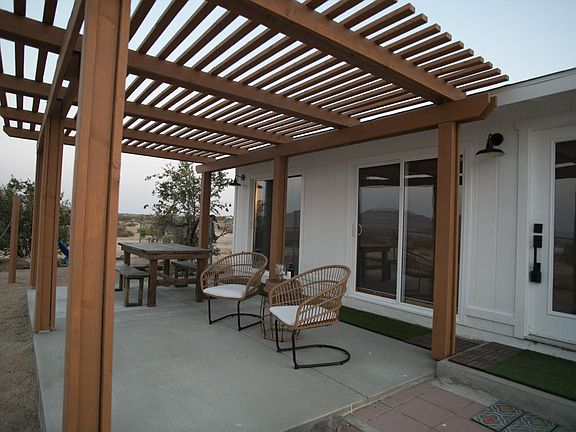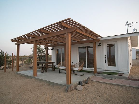 Escape to star filled nights, beautiful sunsets and endless outdoor adventures. Make this house your dessert retreat, vacation home, or full time residence. This house encompasses 5 Acres and 360 degree mountain views. Ideal for Airbnb and meets all Airbnb County of San Bernardino regulations. Cabin features two bedrooms and one bath. All rooms have been tastefully renovated and ready to enjoy the desert life. Home includes all brand new stainless steel appliances, including dishwasher, microwave, stove, refrigerator, washer and dryer. Kitchen features a large island with butcher block countertop and enough seating for 6. Designer bathroom with walk in shower. Dual paned windows throughout. New tankless water heater, new AC, new roof, new plumbing and new electrical. Includes a newly constructed shed for your recreational vehicles, bikes or RC toys. Bring your hammocks and telescope for stargazing or enjoy a glass of wine in the front large arbor, perfect for watching the sunset, exploring the desert wildlife or sitting by the outdoor firepit that includes seating. Enjoy the pomegranates and grapes from the fruit trees on property. This vacation home is close to Johnson Valley ORV and camping area, 7 miles from Integratron and Gubler Orchids, 15 miles to Joshua Tree Coffee Company and Joshua Tree Visitor Center. Park entrance is 44 miles away. 12 miles from Pioneertown. Have your own 5 acres of serenity and enjoy your own private views of magical Landers!