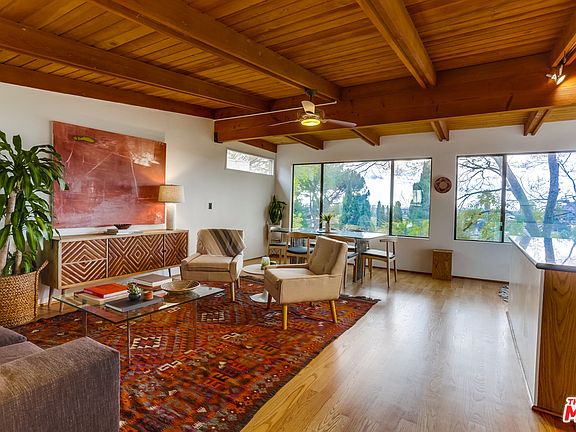 Prime Franklin hills circa 1950 Mid-Century w/spectacular sweeping city to ocean views! This freshly painted, classy 2 bed, 1 bath gem w/bonus room is on a huge double lot w/zen like grounds w/new landscaping. The living rm and master bedrm open on to a tranquil deck w/expansive views. 2nd bedrm opens on to an entertainer's private patio w/a retractable awning and a soothing spa. Sexy, cool bathrm has shower w/dual shower heads. Features include beamed ceilings, 3 lighted ceiling fans, refinished hardwood floors, new carpet, tankless water heater, and an alarm system. The master bedrm has built-in shelves and a clothes closet w/built-in drawers. Great cook's kitchen has granite counter tops, stainless steel appliances, and a breakfast bar. The downstairs bonus room makes a great home office or studio boasting stunning views and has access to a spacious storage area. The outdoor deck, patio and grounds are ideal for entertaining, relaxing, and dining al-freso. Sophistication and style!