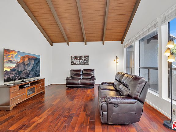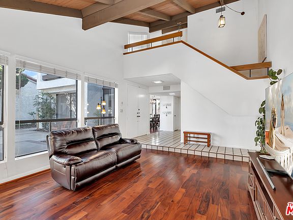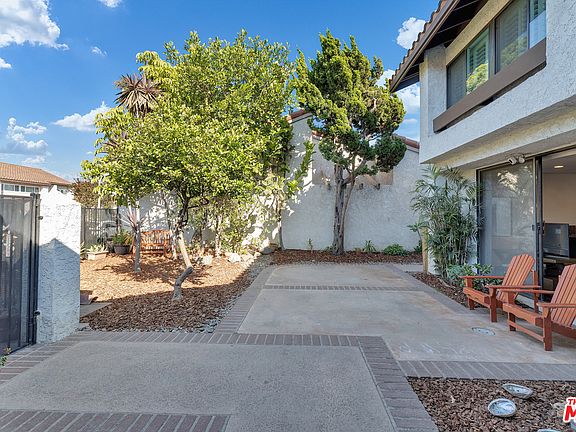 Bright and open four bedroom, three bath home located on a quiet cul-de-sac in Studio Estates. This well laid out floor plan features a spacious living room, dining area and family room that overlook a large private courtyard, perfect for indoor/outdoor entertainment. Floor to ceiling windows bring in an abundance of light with views of the lush outdoor space. The kitchen includes upgraded appliances with a built-in stove and microwave and opens to the living room, dining area and back yard. There is one bedroom and bathroom downstairs, and three bedrooms upstairs including a spacious master suite with vaulted ceilings, double vanity, sunken tub and separate shower. Additional features include an attached garage, newer HVAC system, newer windows upstairs and plantation shutters. Excellent school district and close proximity to downtown Culver City, restaurants, shopping and entertainment.