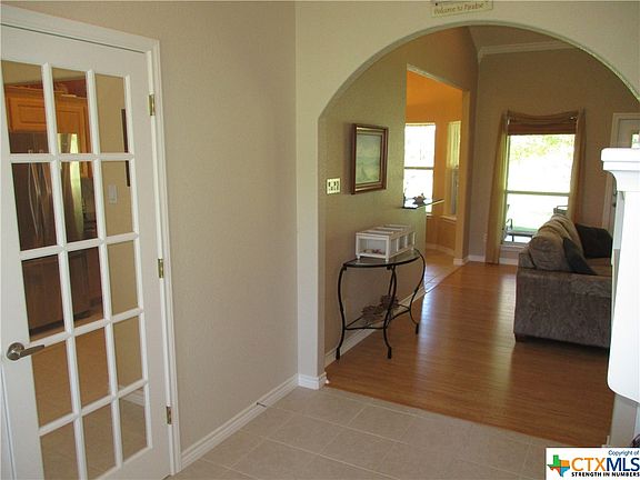 Nestled in the desirable Wells Ranch subdivision, this elegant, move-in-ready, 2,005 SF, 4 BR, 2 bath immaculately maintained home with large lot is convenient to schools, shopping, and churches and is a fantastic value. There is a very spacious living room with raised ceilings, crown molding, lots of windows and wood laminate flooring. Double French doors highlight the formal dining room just off the kitchen. Informal dining area with breakfast bar provides lots of space to entertain. Beautifully designed kitchen is spacious and offers custom cabinets, built-in microwave and updated appliances. Separate utility room. No walking through the utility room to get somewhere! Ceiling fans and lots of closet space in each bedroom. Master bedroom has ceiling fan, crown molding and the master bath features a double vanity, separate shower, jetted tub and walk in closet. No carpet in this home. Huge backyard is shaded by beautiful, mature trees, surrounded by privacy fence and features a 16’x12’ storage building. Peaceful living outside city limits. All measured representations are approximate.