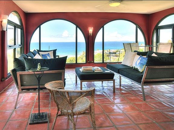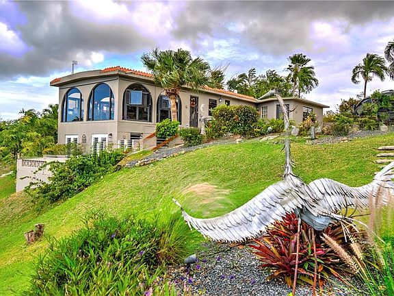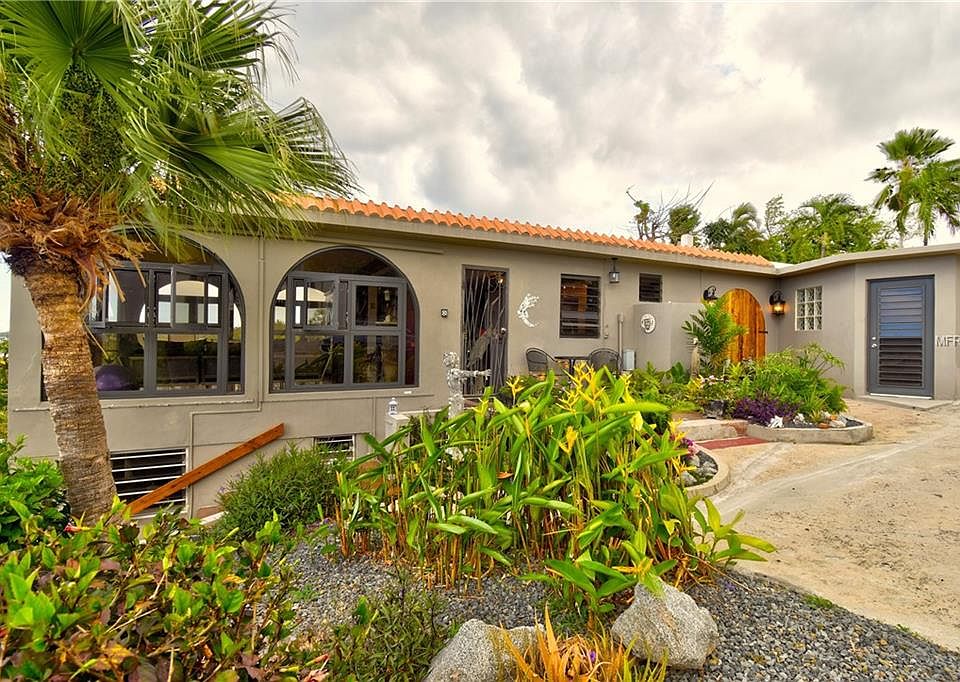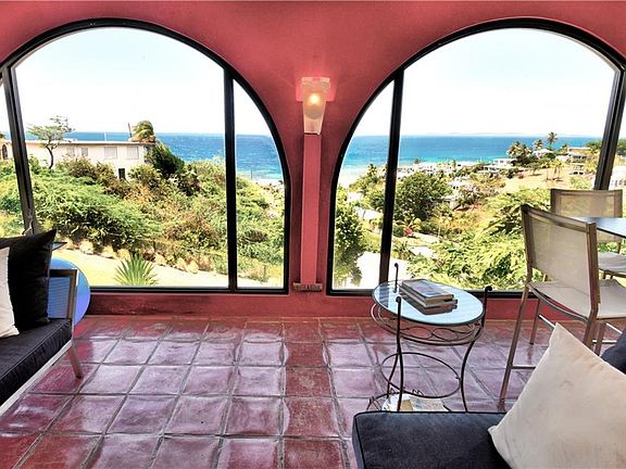 Views and style are the key features of this Bravos de Boston home in Vieques. Upper house boasts 1600 sq ft and guest casita below has an additional 500 sq ft of interior living space. The house is set back from the road maximizing one of the best views of the Atlantic on the island. Both doors to enter the home are dramatic. Custom wood arched doors open into a beautiful atrium with ceiling glass blocks bathing the space in light. Walk through the atrium to reach the french doors that open to the back deck and pool area. The custom welded kitchen door in the shape of an egret blend art and function. The living room with arched windows face HUGE views of the Atlantic ocean. Dramatic backlit decorative niches and the mosaic inlaid tile from India in the kitchen pop the dark concrete countertops and shelving. The two bedrooms each have their own entrance from outside and are bright, airy and air conditioned. The powder room has granite tile and the master walk in closet has South American cedar drawers and shelving. The plunge pool with an infinity edge and beautiful garden space make this property ideal for entertaining. The downstairs apartment is accessible from 2 exterior stairs. It features french doors, private terrace surrounded by papaya and full views of the ocean. Full kitchen, bath and AC make this an ideal income producing unit. Fully fenced well maintained yard has unique sculptures and water features throughout. Untitled/Cash Only. Owner financing possible.
