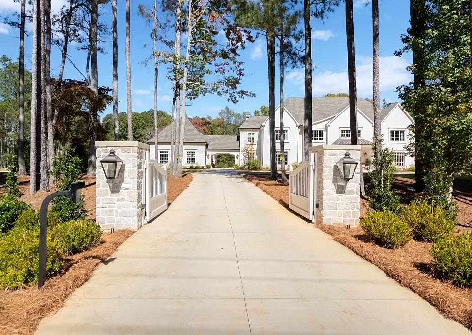 Set behind a private gated entry with gas lanterns, this extraordinary 6-bedroom, 6.5-bath estate showcases timeless stone and brick architecture on 3 pristine acres, offering over 9,000 square feet of refined living space. Designed with uncompromising attention to detail, the home blends classic craftsmanship with modern luxury. A custom antique white oak front door opens to a breathtaking grand foyer with soaring 25-foot ceilings and a dramatic curved staircase. Large aluminum-clad windows and French doors flood the home with natural light, highlighting elegant arched doorways, engineered wide-plank white oak floors, fluted custom doors, and exceptional millwork throughout. The expansive family room features 12-foot tongue-and-groove ceilings with exposed beams and is anchored by an impressive Indiana limestone fireplace. The chef's kitchen is a true showpiece, boasting custom inset white oak cabinetry, marble countertops, oversized center island with garden sink and a full suite of Sub-Zero and Wolf appliances. A fully equipped scullery includes a steam oven, standard oven, warming drawer, second dishwasher and abundant storage ideal for seamless entertaining. Adjacent, the formal dining room offers a wet bar and wine display set against a striking stone feature wall. The private owner's suite on the main level is a tranquil retreat with a gas fireplace, separate sitting area, and serene wooded views. The spa-inspired bath features dual vanities, an arched frameless glass shower with dual shower heads, designer tile niches and a massive custom closet with center island, shoe display, handbag display and stacked washer/dryer with steam closet. One of a kind task room/laundry room on main. The secondary level includes four spacious en-suite bedrooms, a dedicated study, an oversized recreation room and convenient laundry facilities. Resort-style outdoor living defines this estate, with over 1,600 square feet of covered porch space, including a vaulted outdoor living area finished in Indiana tumbled limestone with automatic screens. The outdoor kitchen features a Wolf grill and side burner with Sub-Zero refrigeration, overlooking a stunning 20x48 saltwater pebble pool with infinity-edge raised spa. A pool house with full wet bar and full bath completes the experience. Additional highlights include home surveillance, extensive exterior lighting, epoxy-floored garages with a dog wash station, and 1,600 square feet of garage storage space, stubbed and ready for future expansion. High-end lighting from Visual Comfort and Rejuvenation enhances the home throughout. This one-of-a-kind estate offers privacy, sophistication, and resort-level amenities an exceptional opportunity for luxury living.
