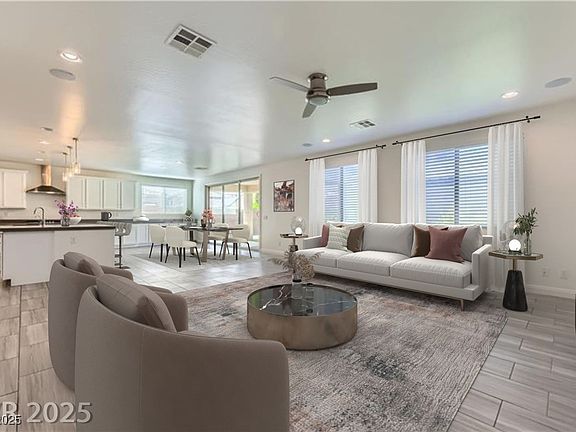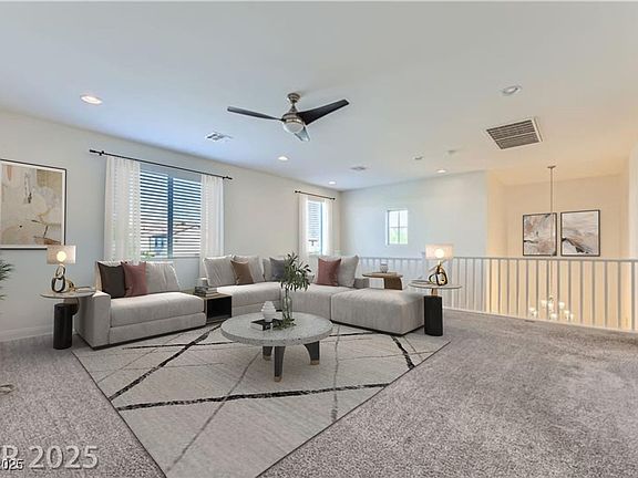 Gated Estates enclave inside the guard-gated Rhodes Ranch community, where you can enjoy country club and golf course living. Stunning two-story home offers 3,609SF of well-designed space. 5 true bedrooms, 4.5 bathrooms, spacious loft, & versatile den. Situated on a pool-sized cul-de-sac lot with a 3 car garage. Open concept living with a grand foyer straight away impressing with its soaring ceilings. Kitchen is complete with a massive island topped with quartz counters, a 5-burner gas cooktop, and expanded sliding doors. Enjoy effortless entertaining on the covered paver patio. Main level complete w/plank porcelain tile flooring. Upstairs, you'll find generously sized secondary bedrooms, including a luxurious primary suite w/mountain views, two vanities, and a large walk-in closet. Low-maintenance yard features synthetic turf and a covered patio, making it easy to enjoy the beautiful surroundings. Huge loft—with gorgeous mountain views.