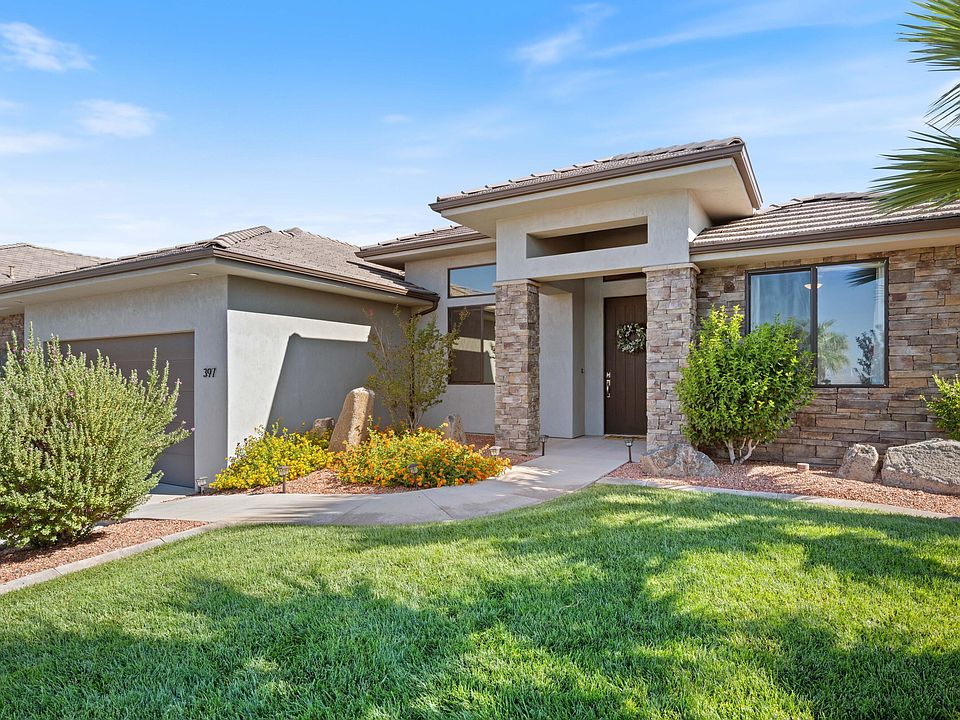 Located on the bluff in the desirable Bella Vista gated community, this home offers easy, low-maintenance living as HOA landscapes for both the entire yard. Ideally located close to I-15, downtown Washington, and a variety of shopping and restaurants, yet remains secluded in a private, exclusive setting. Thoughtfully designed with a spacious open floor plan, it features a chef's kitchen with oversized island, quartz countertops, stainless steel appliances, and a large walk-in pantry. The primary bedroom is complete with a walk-in shower, separate deep tub, and spacious walk-in closet. A versatile office/bedroom offers the perfect space. The large northeast-facing covered patio provides shade for evening relaxation. The epoxy-coated garage adds durability and is complemented by a finished, 10x10 lighted attic-ideal for organized storage. HOA fees cover the gate, roads and weekly landscaping (front and backyards). HOA transfer and reinvestment fee totals $1,300 (includes payoff statement). Garage freezer and workbench are included; Wicker patio table and chairs, BBQ Grill and propane fire pit included; Drapes & rods are included.
