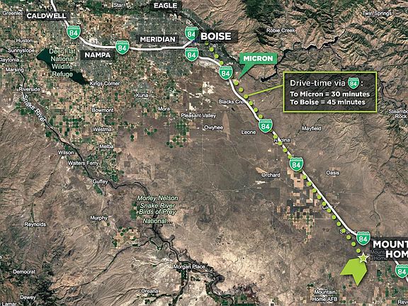 Ideally located between the City of Mountain Home, Mountain Home Air Force Base, and the regional airport—offering excellent connectivity Flat, development-ready topography with power conveniently located across the road -Perfectly suited for a laydown yard, solar project, or a variety of commercial or industrial uses. -Just 45 minutes to Boise via direct access to nearby I-84. -Strong upside potential for land investment or future commercial development. -Located within the City of Mountain Home’s Area of Impact, positioning the property well for future annexation and infrastructure support. -Two major proposed casinos will be located less than 20 minutes from the site and are projected to bring thousand of jobs to the area in the coming years.