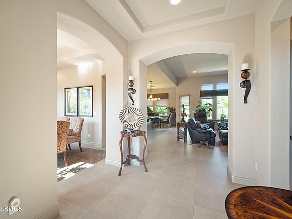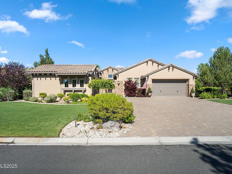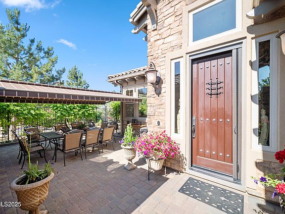 Your dream home awaits! Welcome to this exquisite 3-bedroom, 3.5-bathroom home, nestled in a tranquil and sought-after neighborhood off Mt. Rose Hwy, The Reserve at Monte Rosa. Upon entering the front door you will be struck by the stunning 24" ceramic tile in the foyer which expands into the kitchen and living areas. Take note of the high ceilings throughout the home, with sofitts in foyer and in the separate dining room. The elevated fireplace is accentuated by the custom built in cabinets on both sides. Natural light pours in through large windows (Hunter Douglas Silhouette Shades), creating a warm and inviting ambiance that feels like home. Imagine cozy evenings by the fireplace, surrounded by custom-built cabinets that add both beauty and functionality. Relax to music with built-in ceiling speakers in the living room. The open floor plan allows you to visit with guests as you prepare meals in the chef's kitchen. This gourmet kitchen is a culinary enthusiast's dream, featuring stainless steel appliances, upgraded granite countertops with knotty alder and cherrywood cabinets with custom pull out draws in lower cabinets. Whether you're preparing a casual meal or hosting a dinner party, this kitchen has everything you need. Take note of the formal dining room that flows into the kitchen just off the foyer. The master bedroom has tall sliders that open to the backyard patio which features 2 electric awnings for "shade or not to shade." The spa-like bathroom includes double sinks and large walk-in closet. An additional, rare feature to the front entry of this home is the courtyard patio. Spacious for family gatherings or summer dining. The courtyard patio also serves as a separate entrance to the backyard. Perfect for keeping an outdoor event without ever having to enter through the front door. This stunning backyard is an oasis of tranquility, with a spacious patio ideal for summer barbecues, lush landscaping, and plenty of room for gardening or outdoor activities. Also, the exterior perimeter is wired for lights during the Holiday Season. Just a flip of a switch from the foyer! Recent upgrades include new granite kitchen countertops, new dishwasher, floors, paint interior and exterior, 6" rain gutters (around perimeter), and paver steps leading to the upper side of backyard. Also, an air purifier was added to the AC unit (2021) to alleviate pollen and dust from entering interior of home. This luxury home is nestled in a private setting just off Mt. Rose Hwy. and was built by a well-known contractor in Reno. This property is a masterpiece of modern living, offering a perfect blend of luxury and comfort. Conveniently located near top-rated schools, shopping centers, and White's Creek park with trails to venture Mt Rose hiking and Mt. biking. In addition, Mt. Rose ski resort is only 20 mins away, 30 mins to Lake Tahoe and 15 mins to the airport. This home offers easy access to everything you need for a comfortable and vibrant lifestyle. Original owner has taken meticulous care of this home.