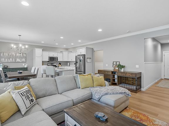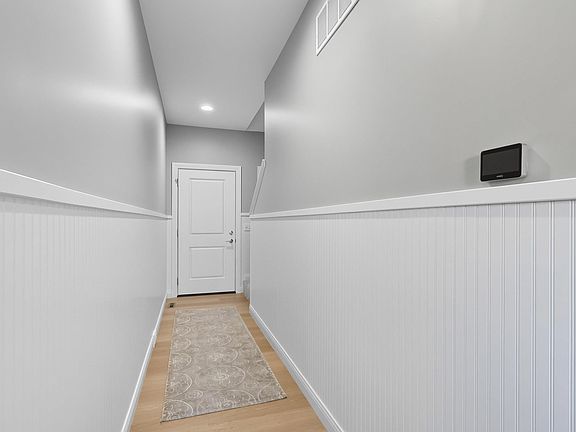 The bright foyer greets you with a window in the stairwell and bead board down the hallway. Luxury vinyl plank flooring flows from the foyer throughout the great room, kitchen and back hallway with a mud room with cubbies and a walk-in closet. Quartz countertops and 9' ceilings! The slider opens to a patio and freshly sodded and landscaped back yard. Vaulted primary suite with double sinks and the walk-in closet is open to the large second floor laundry with folding table. The main bath has double sinks as well. The basement is ready to finish with a rough-in for a bath and egress window for a bedroom and/or rec room. HOA includes lawn maintenance and snow removal. Enjoy carefree living in this beautiful townhome near many conveniences and the bike path!