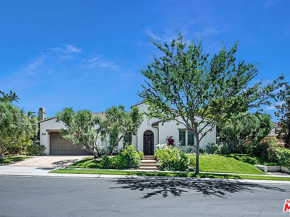 Highly sought after modern and trendy 1STY in The Oaks of Calabasas on tree-lined culdesac. Monterey exterior with custom made scrolled iron entry gates. Twin olive trees flank the drive. Dark hardwood floors flow thru-out most of the interior. Tall ceilings, walls of windows and doors, light-infused and 2 FP's. Muted neutral painted tones on walls thru-out. White Carrara marble counters in open concept floor plan, chef's kitchen with white subway tile backsplashes and white raised paneled wrap around cab's. Top of the line stainless appl's, wine refrigerator and large center isle to eat at and gather around. Built in organizing desk and separate breakfast room all adjacent to oversized FR w/media niche, double tier windows and raised hearth FP. LUXE master suite set on its own with tall ceilings, double tier windows and spa-like master bath retreat w/oval soaking tub, dual sink vanities with stone countertops. Indoor laundry room suite w/sink & extra storage cabs.
