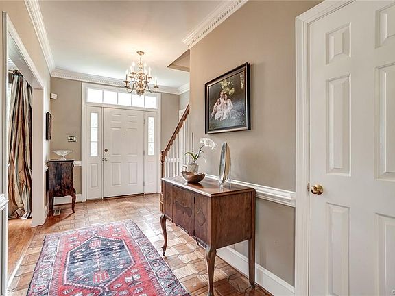 Steeped in architectural detail & craftsmanship this property offers plenty of indoor & outdoor living space. Stylish and traditional, the foyer welcomes you with parquet floors, gorgeous mouldings & chandelier. Elegant dining room with inlaid wood floors is spacious enough for a banquet sized table! The living room has a gas fireplace w/lighting to feature your favorite artwork. Gather in the family room around the wood burning fireplace, enjoy refreshments from the wet bar. Bright kitchen with white cabinets ,granite counter tops and over sized island w/ built in cook top. You are always facing your family & friends while preparing meals. Wonderfully accessible mud room through kitchen and garage for ultimate convenience. Just when you think you have seen it all, a masterfully designed octagonal room with floor to ceiling stone fireplace await. Second level features an unbelievable master w/hardwood floors, fireplace, two walk in closets and luxury bath with private balcony/deck. Four more spacious bedrooms, two w/ window seats. A creek borders the rear yard, enjoy the sounds of the rippling water on the terraces overlooking mature trees and woods. Steps from playground.