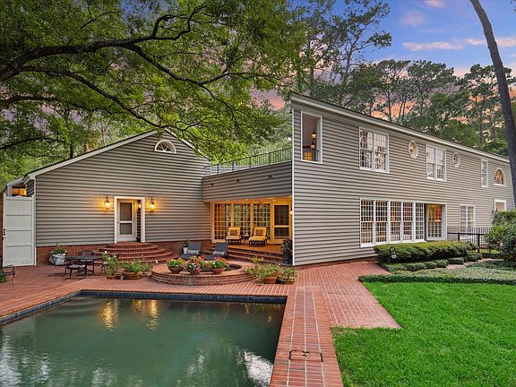 Nestled in the Tall Timbers section of River Oaks, this exquisite residence, built in 1984, epitomizes timeless elegance and architectural brilliance. Designed by the renowned Ray Bailey Architects, this modified New England "Salt Box" home received a 1985 Houston AIA award. Set on a sprawling one-plus acre wooded lot, the property seamlessly blends contemporary details with New England-style reserve, creating a perfect hybrid design that continues to captivate. The home's structural integrity is ensured by a steel-enforced concrete pier and beam foundation. Special amenities abound, including approximately 100-year-old reclaimed wide plank hardwood floors, exterior moisture-resistant cypress wood siding, a commercial-grade heating and cooling system, a slate tile roof, climate-controlled wine cellar, 4-car attached garage, and more! The kitchen, baths, attached greenhouse, screened porch and gallery have hand-molded brick floors. This home reflects forethought and attention to detail.