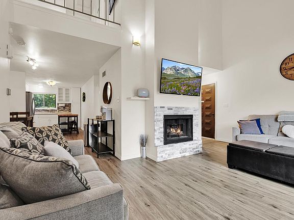 Private entrance overlooking trees and greenspace! This contemporary 3 BED, 2 BATH two-story condo features cathedral ceilings, a gas fireplace, and LVP floors carried through most of the main level. Kitchen offers stainless steel appliances, white cabinetry, island seating, and tile backsplash. Main-level bedroom and full bath with tiled tub surround. Upstairs has two spacious bedrooms, full bath with double sinks, and owner's suite with double closets. Bring your finishing touches to the partially finished lower level with rec room, office or playroom, roughed-in bath, and laundry. Includes surface parking and private attached garage. Enjoy private patio, community pool, tennis, play area, and walking trails. Pets welcome!