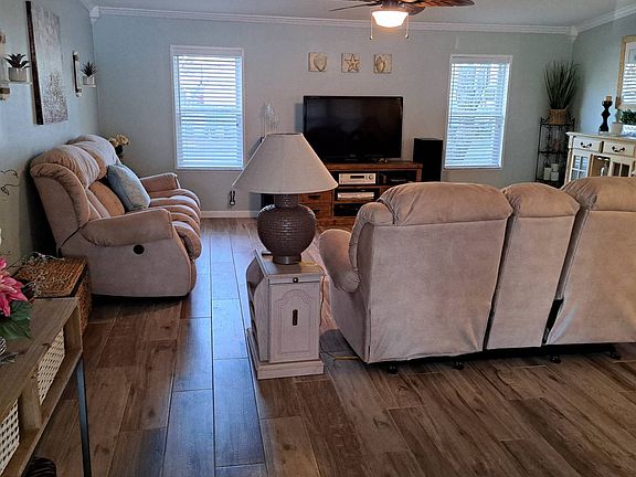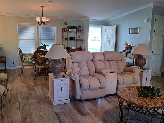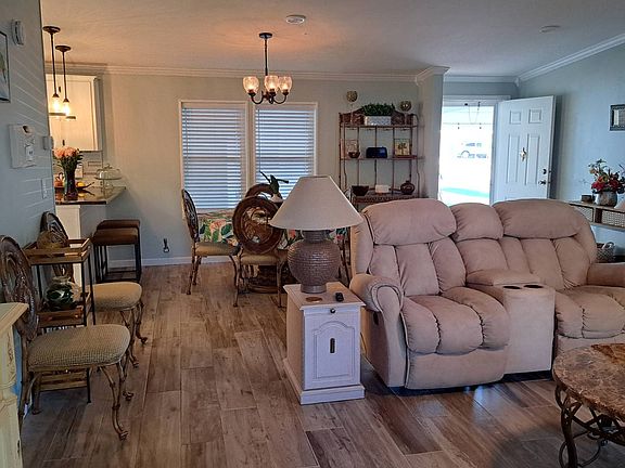 Located in a beautiful gated and active 55+ community. Minutes away from downtown Zephyrhills where there are restaurants, shopping and medical facilities. The home in a great location on a corner lot with beautiful trees and a pond, when filled with water it is home to several species of birds making for a lovely view. This 1830 sq.ft home has nothing but style. A six month old roof covers a three bedroom, two bath home with a fully equipped kitchen. Kitchen has large pantry, new stove and farmhouse sink. Inside laundry. Vaulted ceilings with two skylights. Corian countertops in main bathroom with double sinks. Guest bath completely remodeled with tub/shower combo. Master bath has walk in shower, double vanity and two walk in closets. Open floor plan that has a nice flow through the family, dining and kitchen. Plank flooring throughout with 1/4" cement board as sub-floor. New double pane windows 2021. AC/heat pump 2014. Glassed in lanai. Oversized double carport with decorative driveway and engineered trusses covering the carport. Dual storage area with garage door. . Beautiful corner lot. Lifetime rubber roof installed over the lanai 2019. Repairs to vapor barrier plus anchors under home installed into cement for more secure protection. Everything is here for you including a golf cart with brand new batteries. So many more features that this is a must see! Call now for an appointment. Lot rent is only $660.