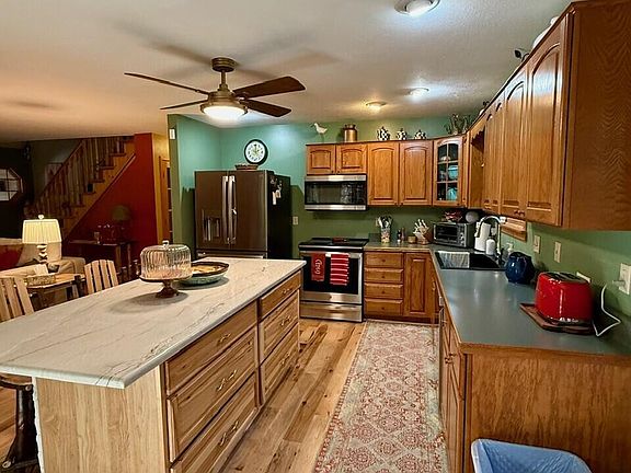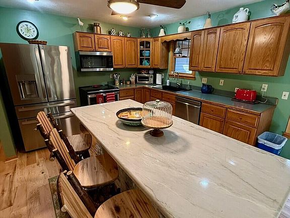 The home boasts a spacious open floor plan with large windows that invite in natural light and showcase the surrounding views. Enjoy a welcoming living area with cozy fireplace, a modern kitchen with ample cabinetry, and gorgeous hickory floors. Step outside to relax on the deck or patio while listening to the sounds of the creek and wildlife.